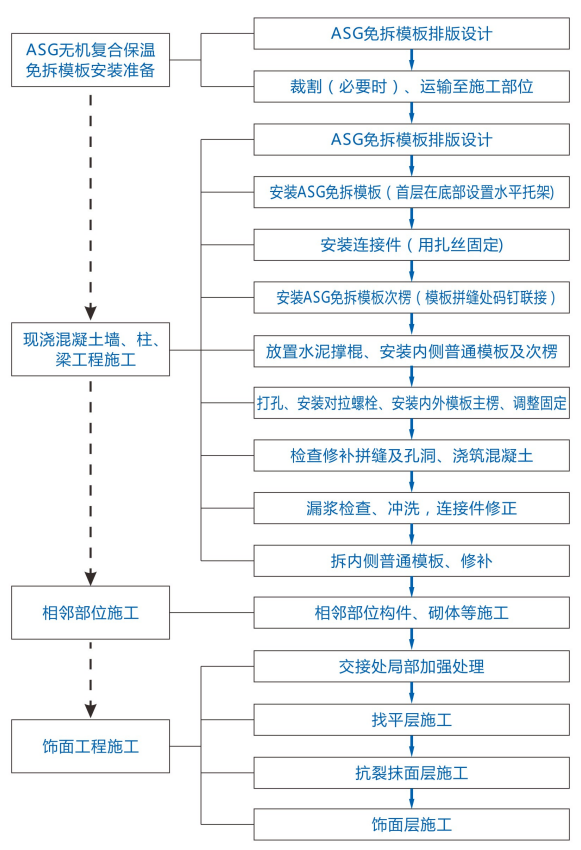 ASG無機(jī)復(fù)合保溫免拆模板可用作各類現(xiàn)澆鋼筋混凝土墻、梁、柱等部位的外模板使用,系統(tǒng)由現(xiàn)澆混凝土結(jié)構(gòu)層、ASG無機(jī)復(fù)合保溫免拆模板、找平層、抗裂抹面層和飾面層等共同組成,輔以連接件與基層現(xiàn)澆混凝土可靠固定,可實現(xiàn)保溫與結(jié)構(gòu)同步施工完成的無空腔復(fù)合墻體保溫構(gòu)造技術(shù)。